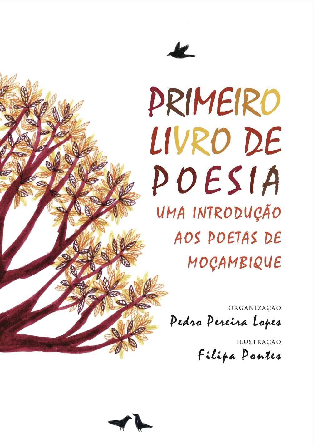 Capa de livro 'Primeiro Livro de Poesia' com árvore ilustrada e texto colorido