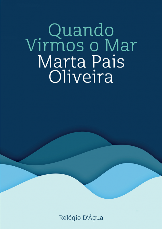 • Capa de livro azul com ondas e texto 'Quando Virmos o Mar', 'Marta Pais Oliveira', 'Relógio D'Água'.