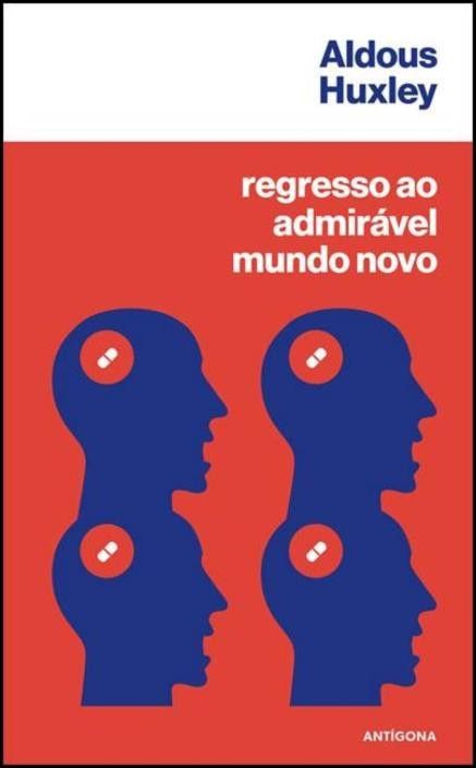 Capa do livro regresso ao admirável mundo novo de Aldous Huxley com silhuetas azuis e comprimidos vermelhos