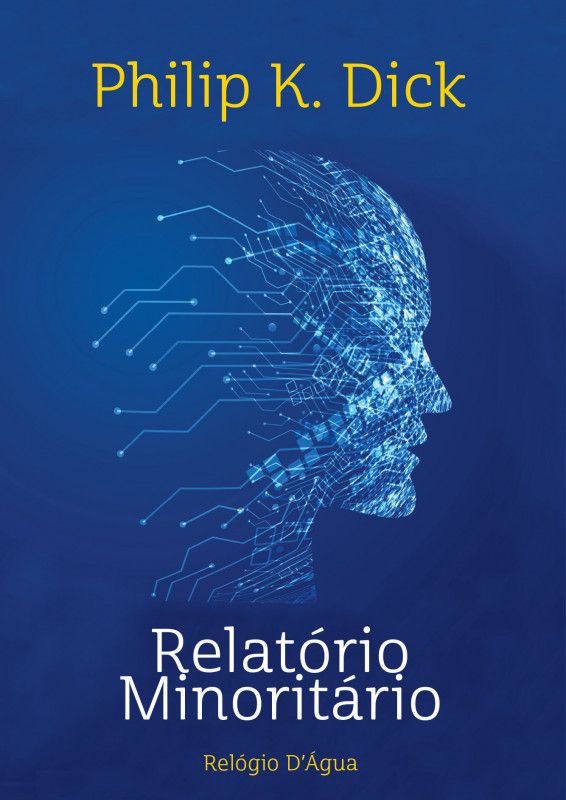 • Capa do livro Relatório Minoritário de Philip K. Dick com uma face de circuitos eletrónicos azul sobre fundo azul escuro.