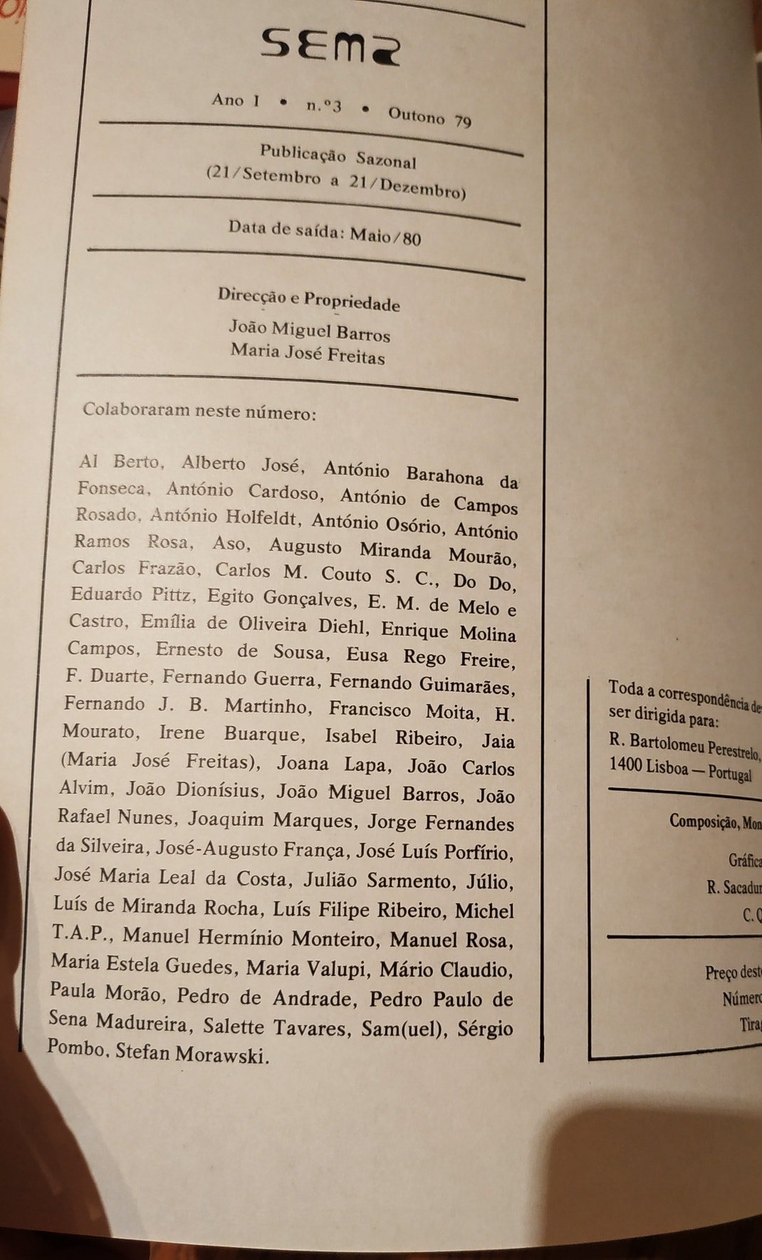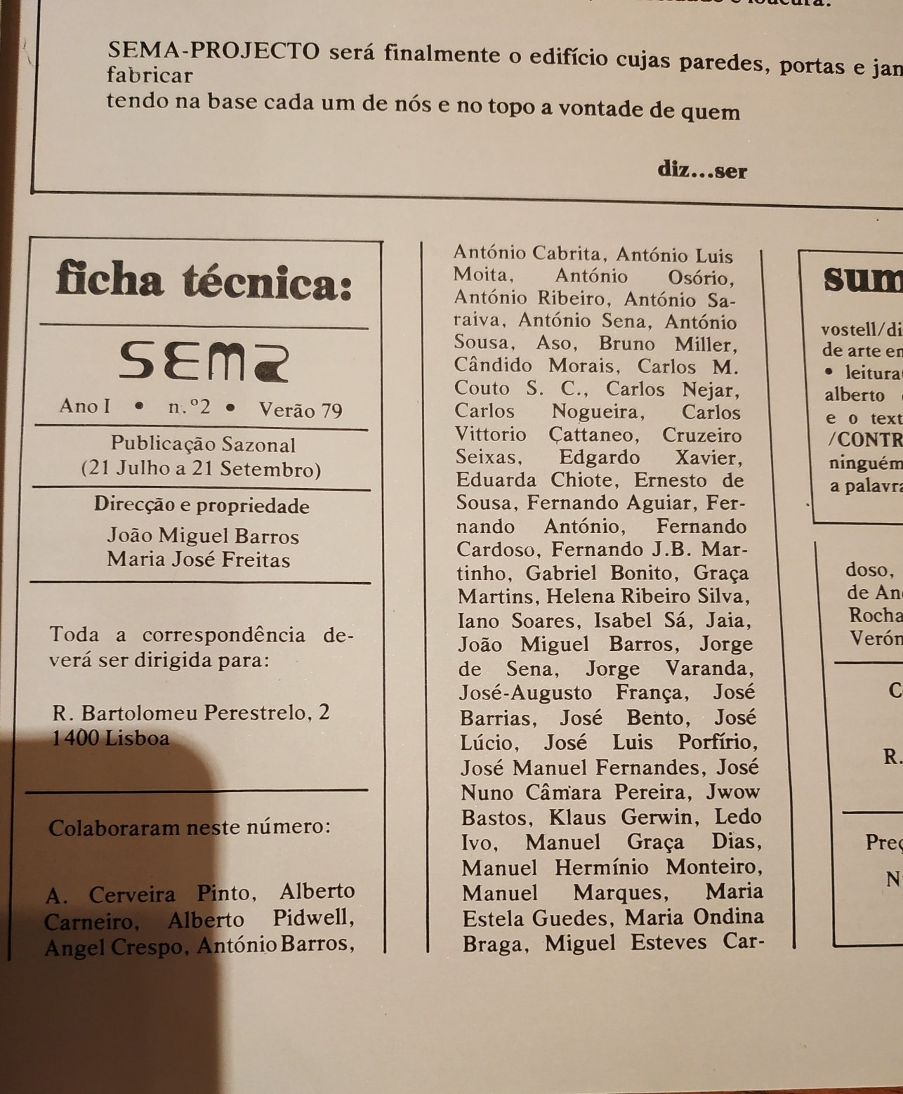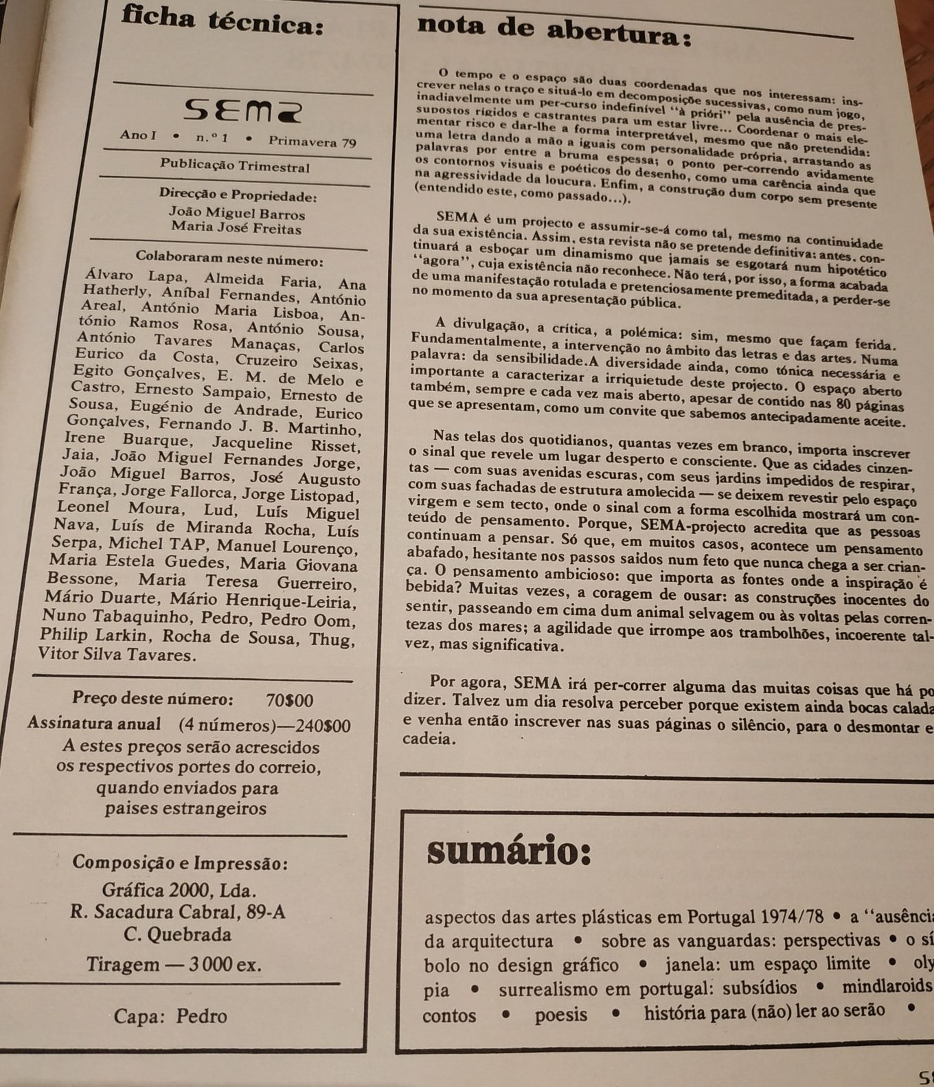 aspectos das artes plásticas em Portugal1974/78 • a "ausência" da arquitectura • sobre as vanguardas: perspectivas • o símbolo no design gráfico • janela: um espaço limite • olympia • surrealismo em portugal: subsídios • mindlaroids • contos • poesis • história para (não)ler ao serão