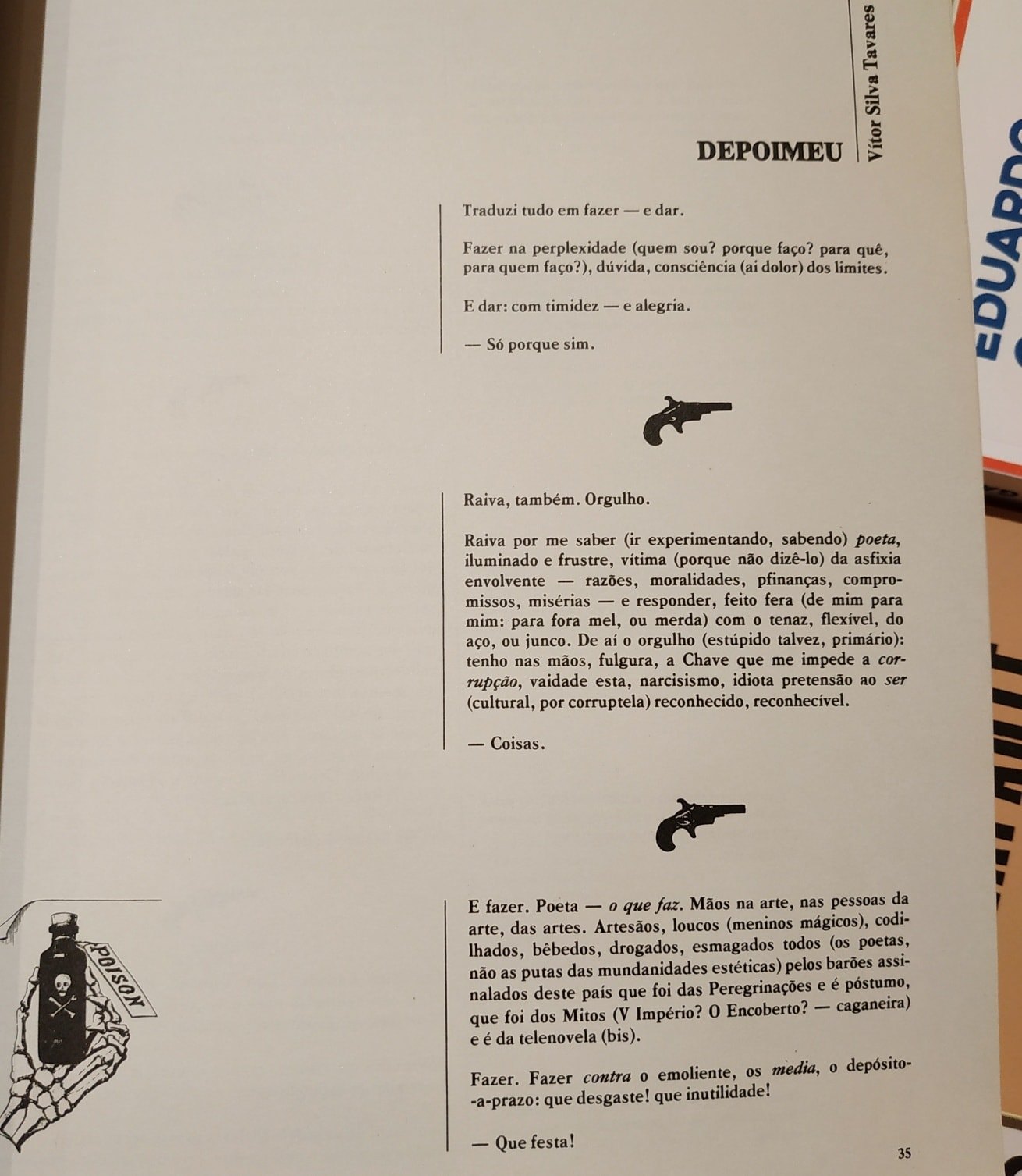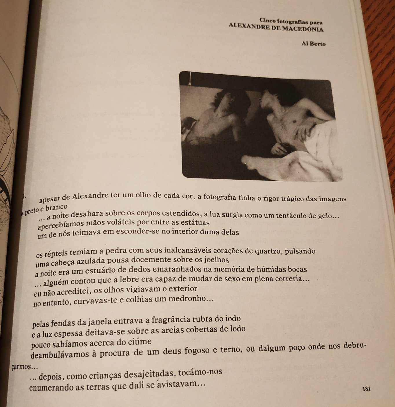 • Página de livro aberta com fotografias a preto e branco e texto em português sobre poesia
