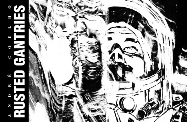 Imagem preto e branco com texto 'ANDRÉ COBELO RUSTED GANTRIES' e figura de astronauta