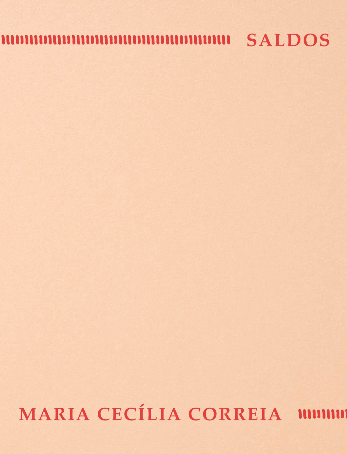 Fundo cor de pêssego com texto vermelho SALDOS e MARIA CECÍLIA CORREIA.