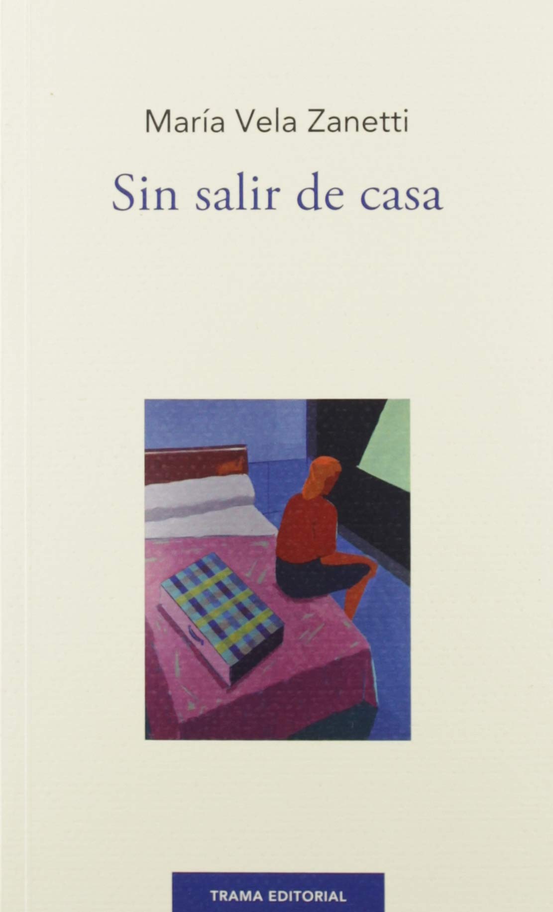 • Capa de livro 'Sin salir de casa' de María Vela Zanetti com ilustração de pessoa sentada em cama com mala às riscas