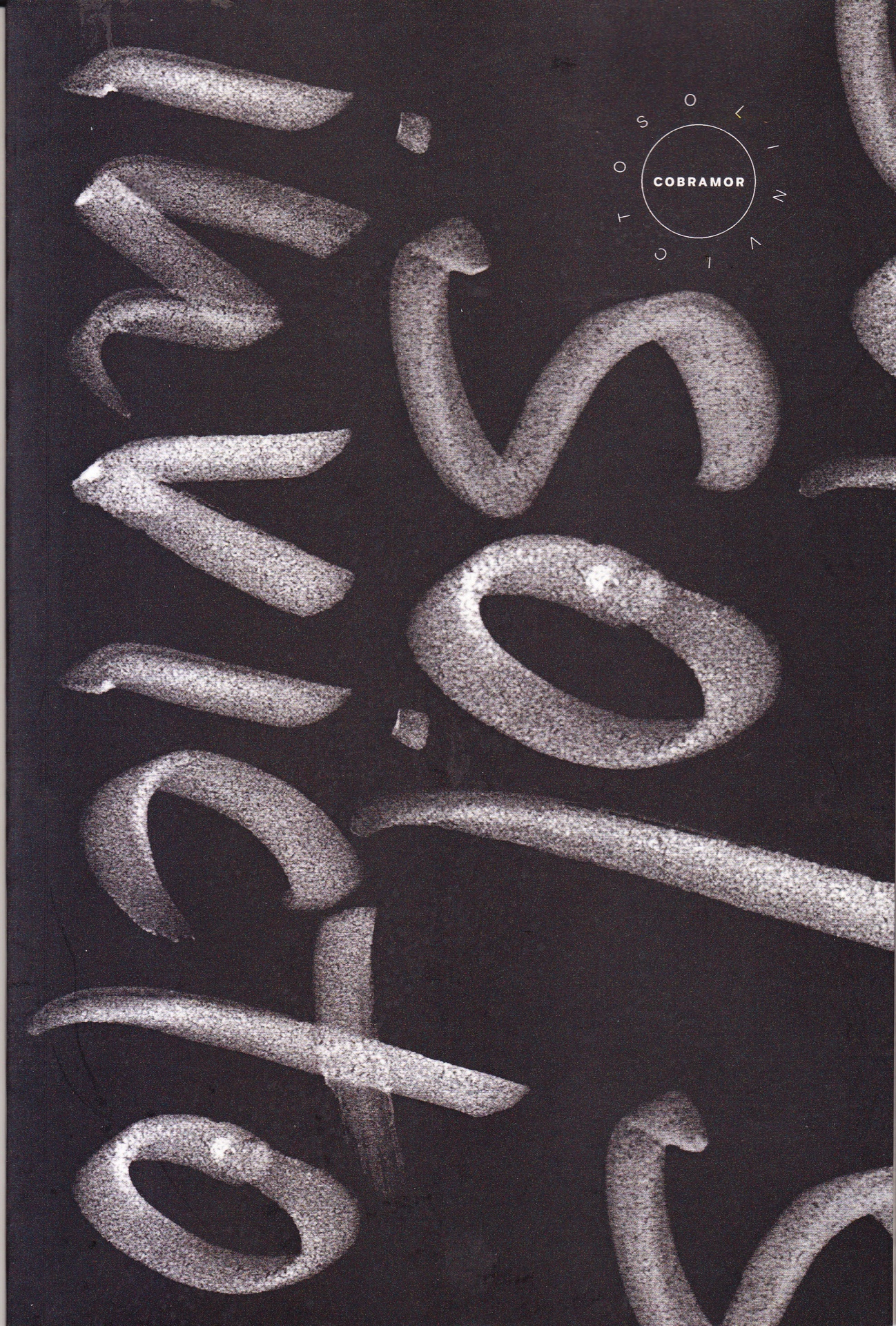 • Capa de livro preta com letras brancas desenhadas a giz e selo circular com texto