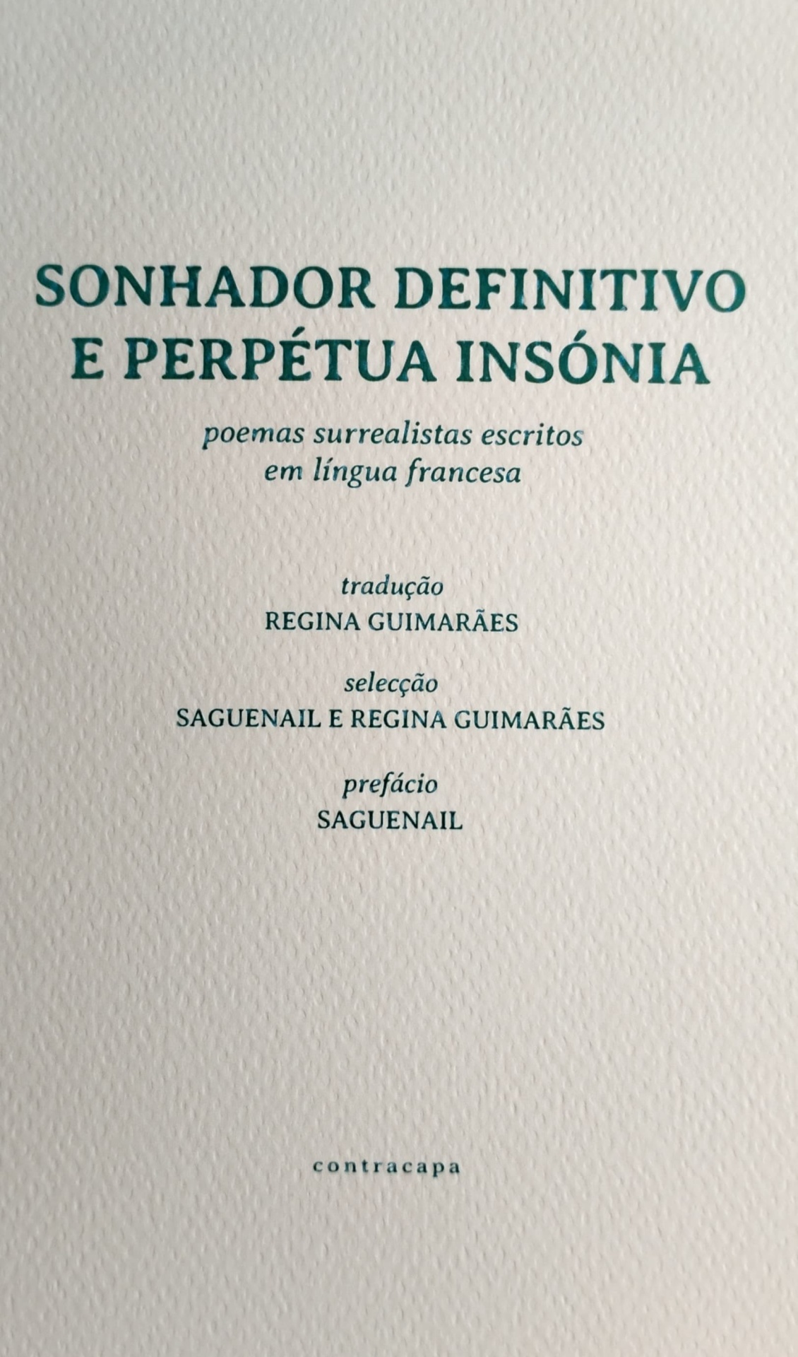 Sonhador Definitivo e Perpétua Insónia 10,00 € Desconto de %. IVA incluído. Partilhar Comprar Contactar Sonhador Definitivo e Perpétua Insóniauma antologia de poemas surrealistas escritos em língua francesa tradução: Regina Guimarãesselecção: Saguenail e Regina Guimarãesprefácio: Saguenail 130 poetas reunidos348 páginasContracapa, 2021 Tags poesia traduzidaRegina GuimarãessaguenailContracapaAntologias2021 Características