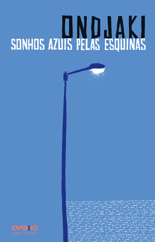 • Capa azul de livro com um candeeiro de rua e texto ONDJAKI SONHOS AZUIS PELAS ESQUINAS