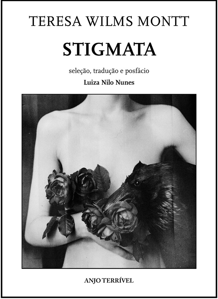 • Capa de livro em preto e branco com título STIGMATA e imagem de figura humana com rosas e corvo