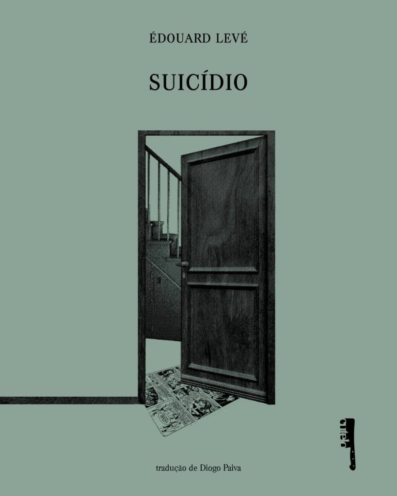 • Capa de livro com porta de madeira meio aberta, título SUICÍDIO e autor ÉDOUARD LEVÉ
