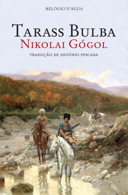 • Capa do livro Tarass Bulba de Nikolai Gógol com pintura de cavaleiros a cavalgar numa ribeira