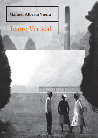 • Capa de livro com título 'Teatro Vertical' e autor 'Manuel Alberto Vieira', com ilustração de três pessoas e chaminé ao fundo.