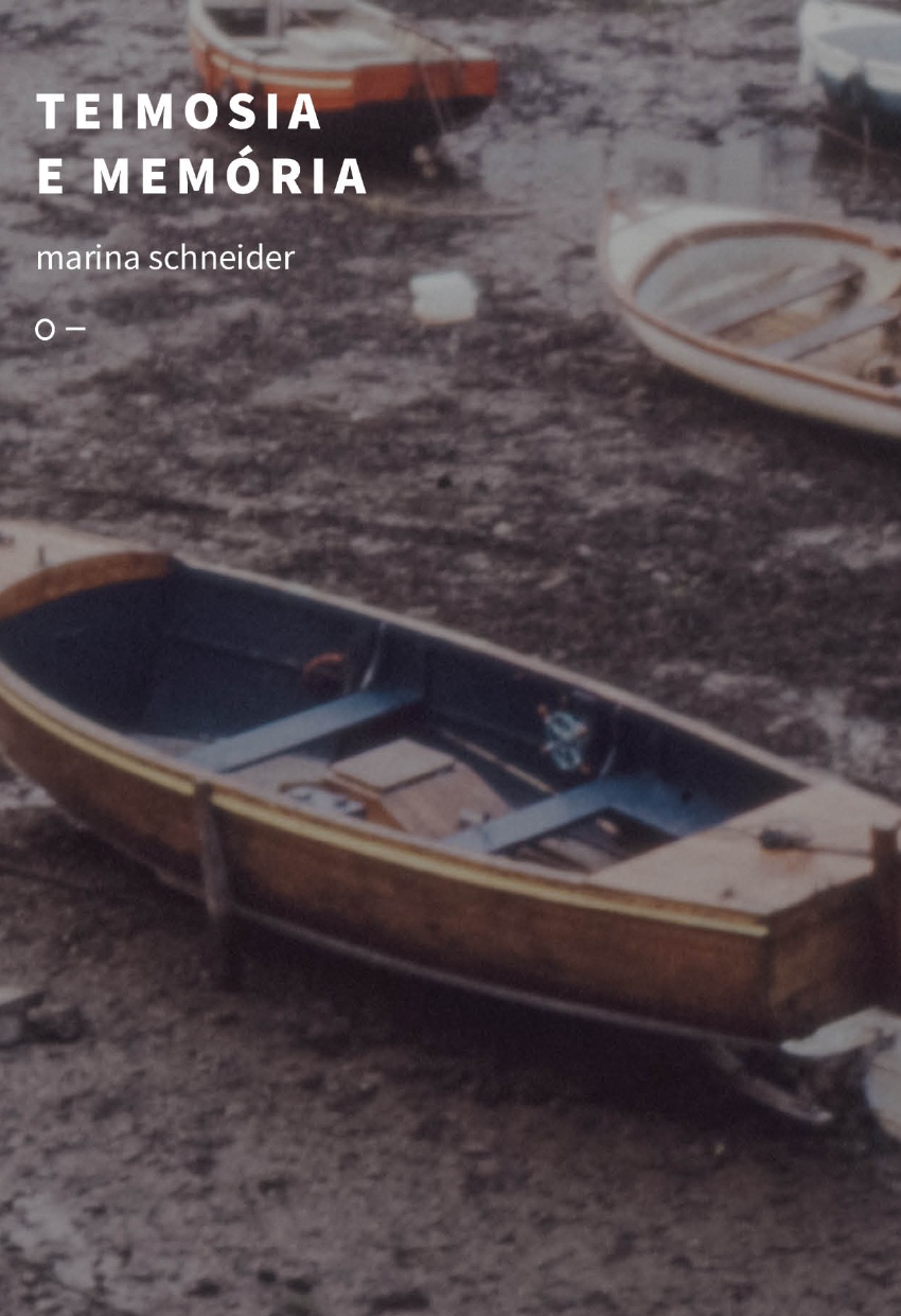 Barco de madeira em maré baixa com texto TEIMOSIA E MEMÓRIA marina schneider o - sobreposto