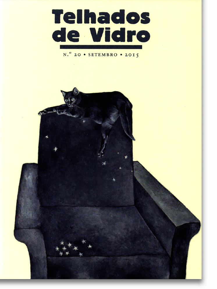 • Capa da revista Telhados de Vidro com gato preto numa poltrona preta.