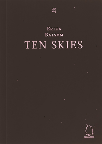 • Capa de livro castanho escuro com texto rosa 'TEN SKIES', 'ERIKA BALSOM', '2004' e um desenho de cabeça no canto inferior direito