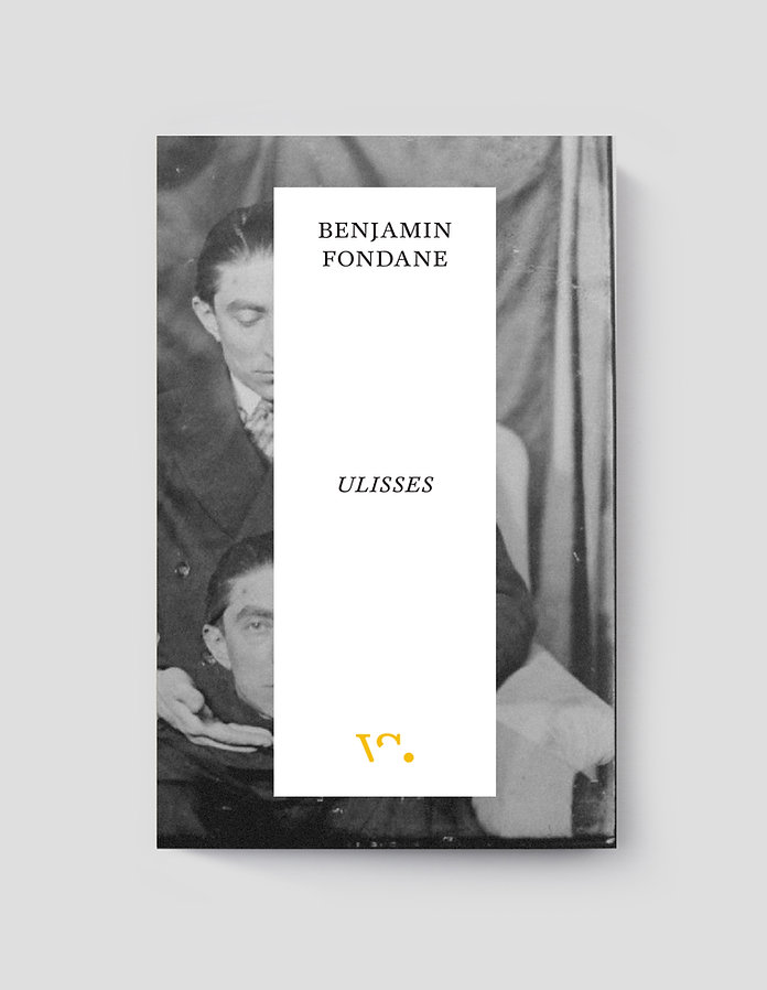• Capa de livro em preto e branco com faixa branca central e texto
