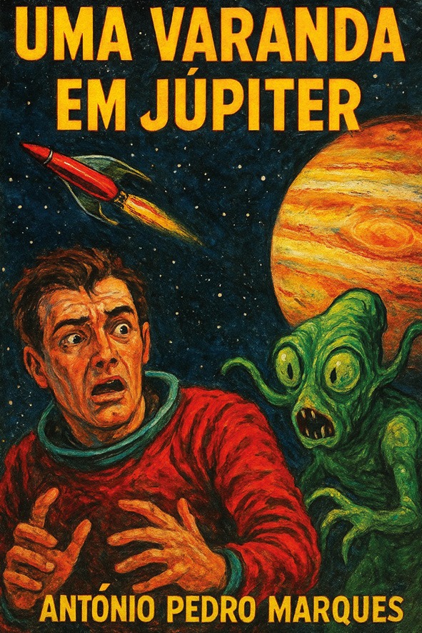 Capa de livro com astronauta assustado, alienígena verde, foguete e planeta Júpiter.