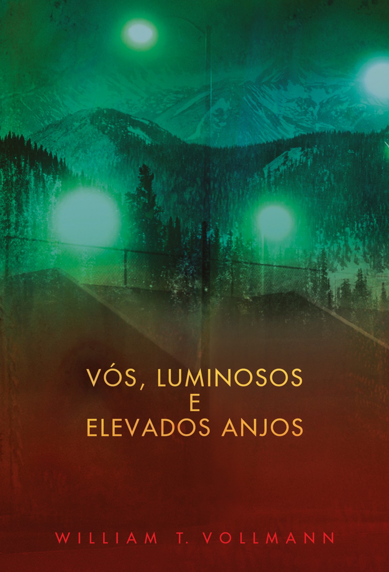 • Capa de livro com texto sobre fundo verde e vermelho com paisagem de montanhas