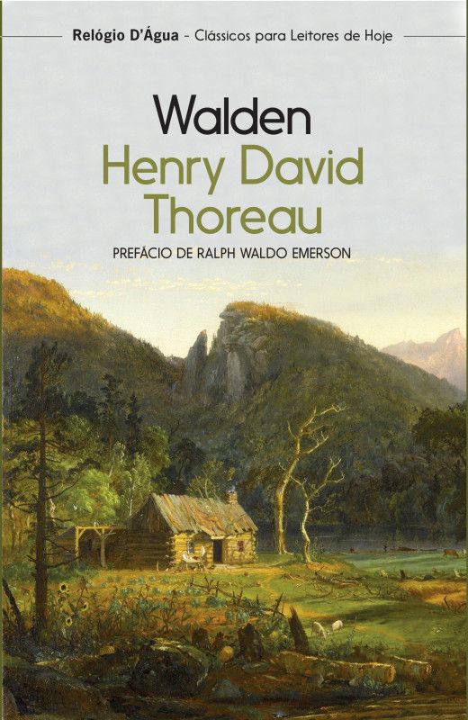 Capa de livro 'Walden' de Henry David Thoreau com imagem de cabana em paisagem natural.