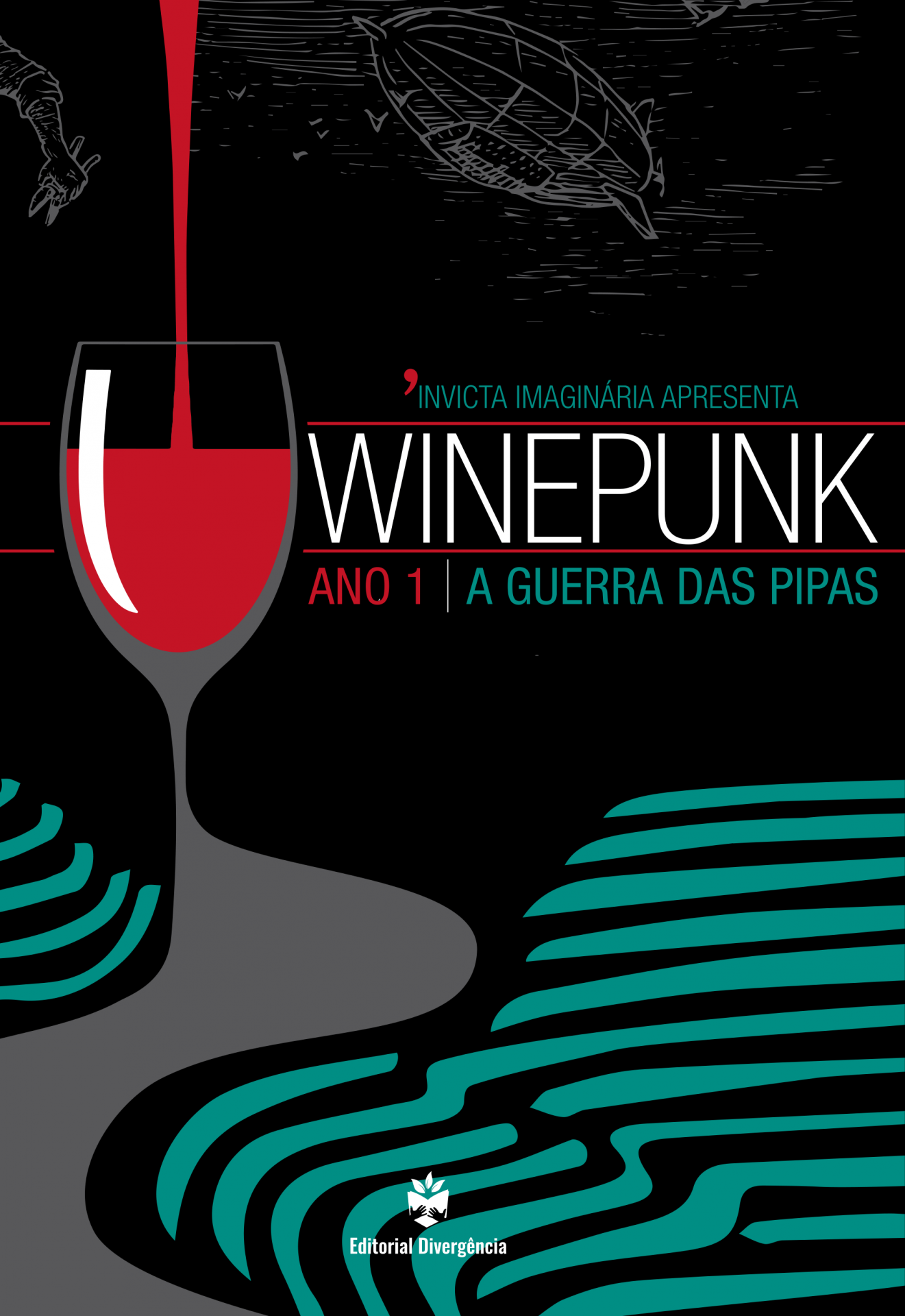 Copo de vinho a ser servido em design estilizado com texto promocional Winepunk