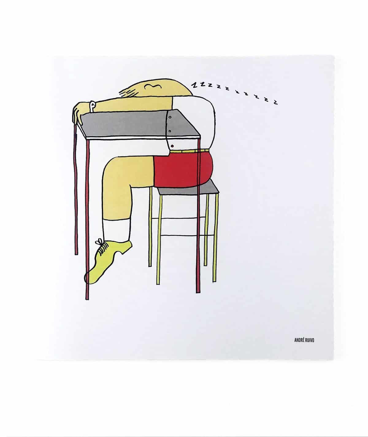 Ilustração de pessoa a dormir numa secretária com zzzs ao lado, em fundo branco