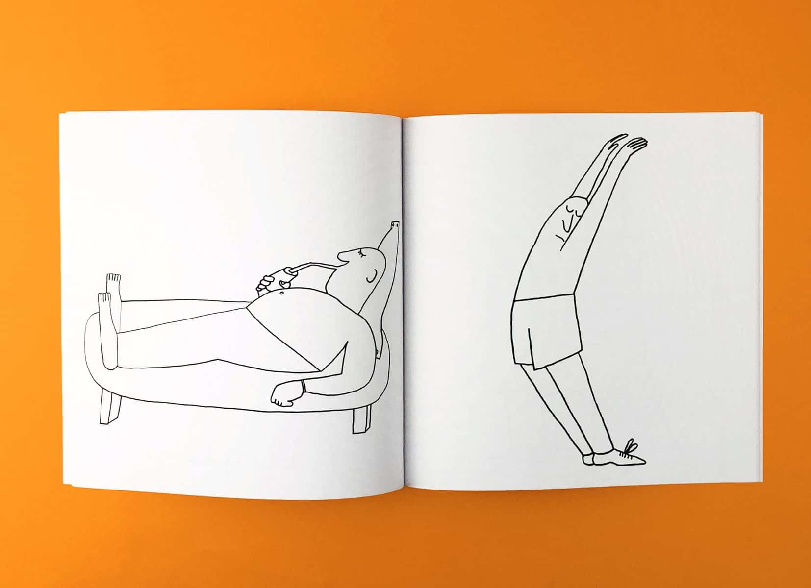 • Livro aberto com ilustrações a preto e branco de um homem deitado e uma figura a esticar-se.