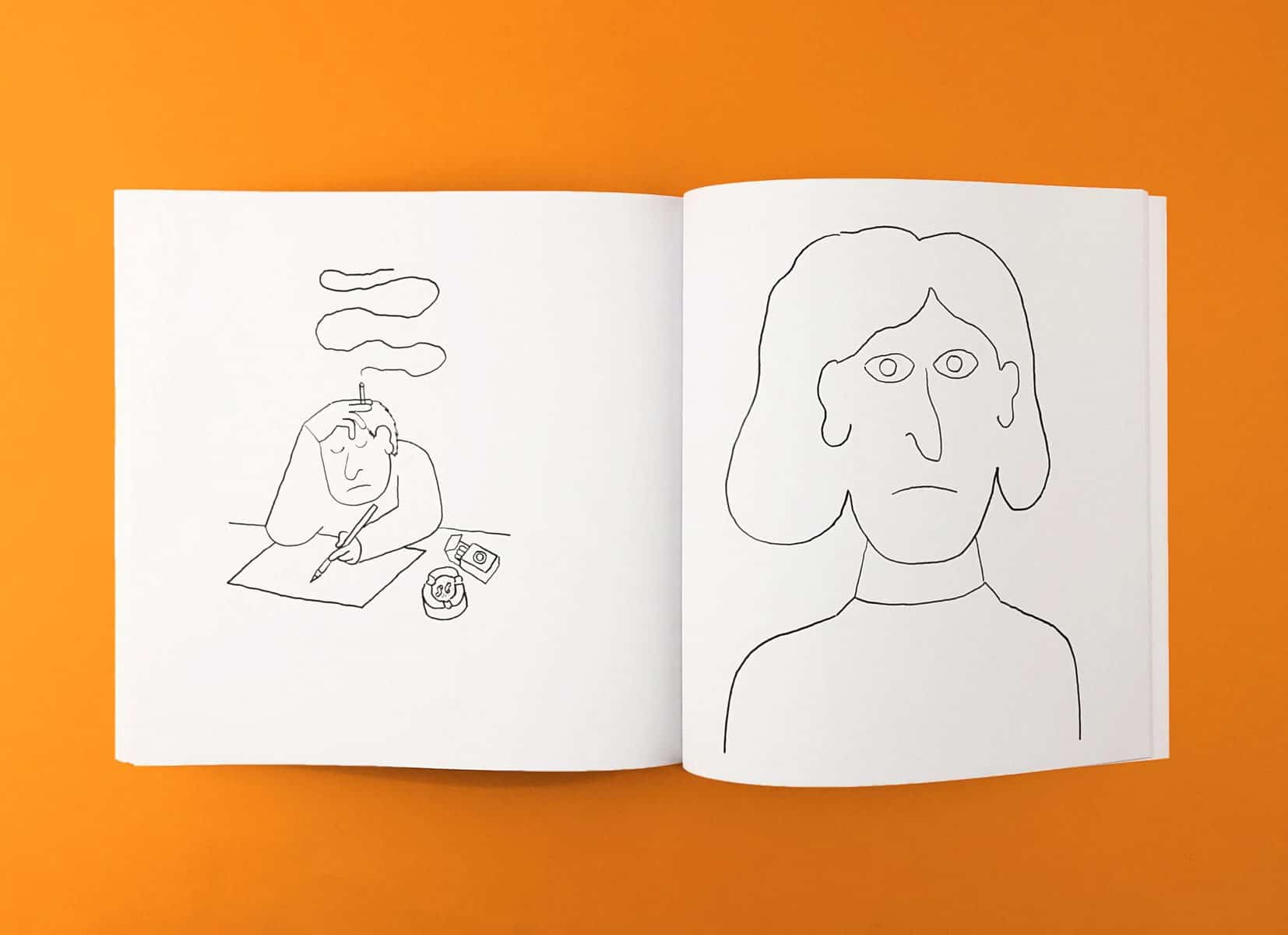 • Livro aberto com ilustrações em preto sobre fundo branco colocado sobre fundo laranja
