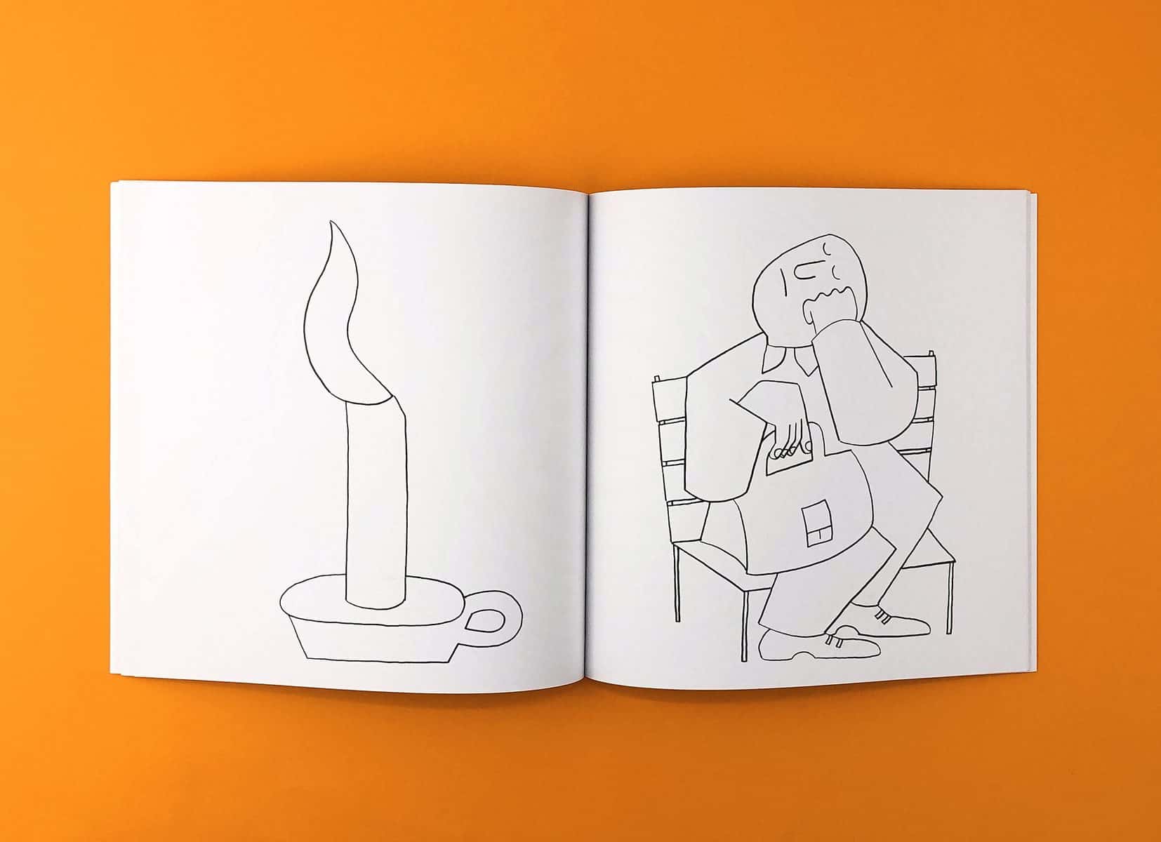 • Livro aberto com desenhos a traço simples de uma vela e uma pessoa sentada numa cadeira.