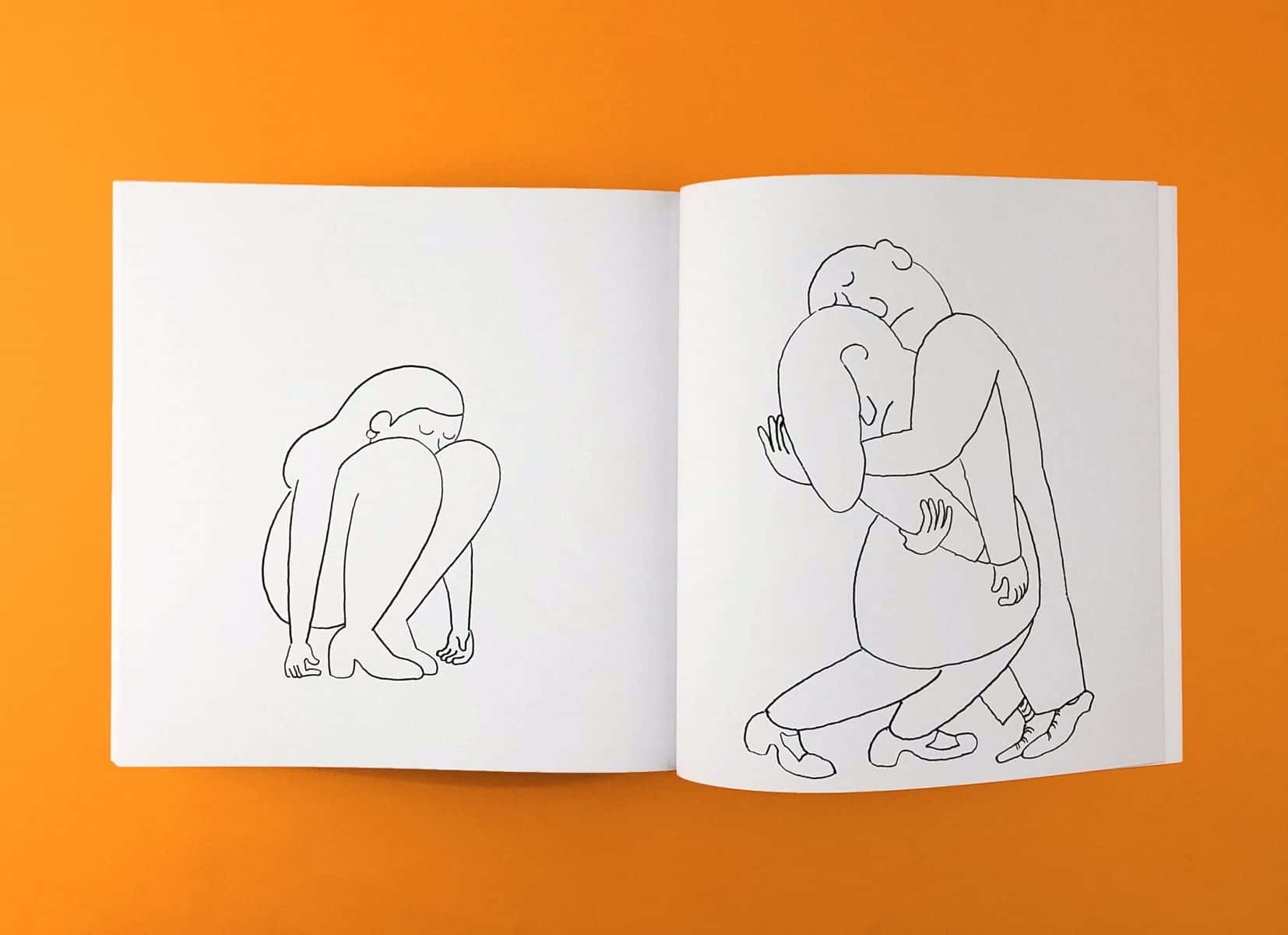 In these fifty-two drawings, all but the cover one in black, a continuous outline defines the characters that are, in the majority of cases, the only elements of the composition. If, on the one hand, the almost geometrical linearity of these drawings draws them closer to cartoons; on the other hand, this simplification shows the interior dispositions of the figures and their bodies movements. Absorbed, closed in on themselves, asleep or enraptured, the figures represent the singularity of the states of mind. It is during these moments they escape the world and, simultaneously, sometimes fall into sleep; on other occasions, they are held, intertwined by their peers, in a mutual drifting dance.